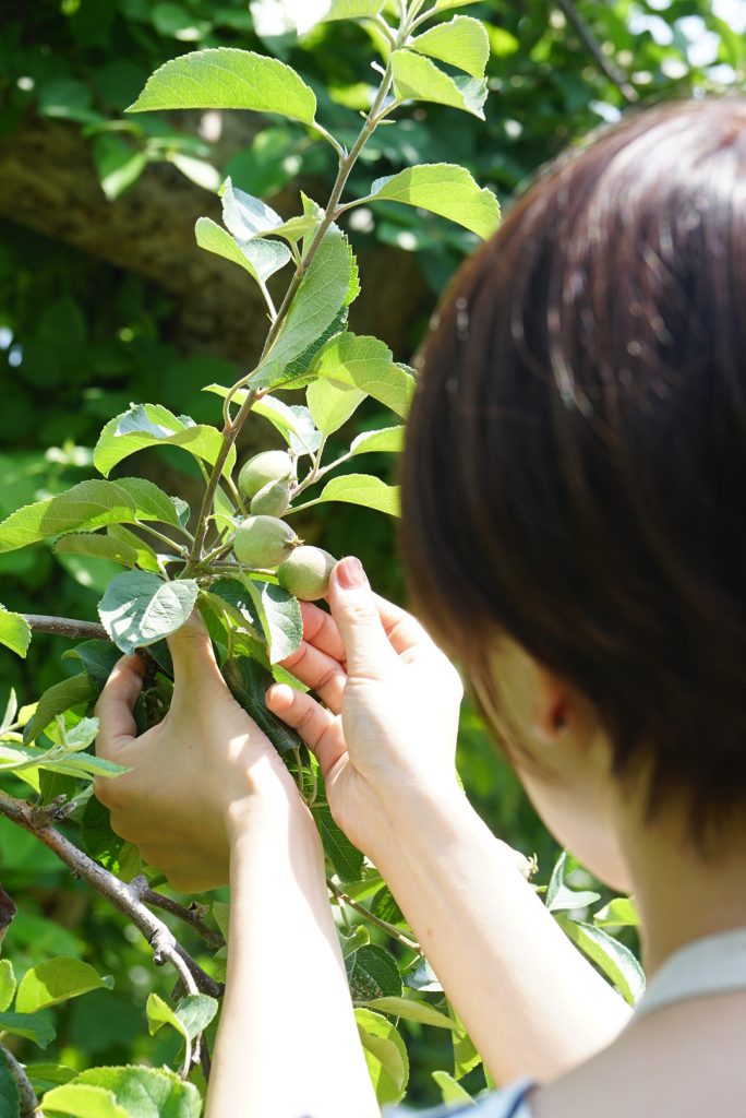 効率の良さのための農薬は使わずに、地道に自分たちで1つ1つのりんごを見て作業する。